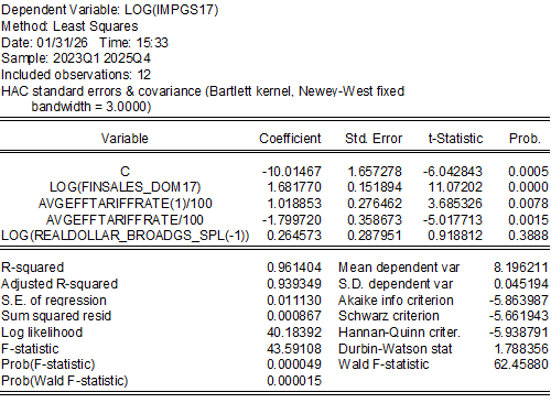 The slowing of the economy (as measured by domestic final sales) and the increase in the contemporaneous tariff rate have roughly equal coefficients. To see what is more important empirically, one can examine scaled, or normalized, regression coefficients (dividing by respective standard deviations) indicates that the impact of the former is about 0.93 and 1.35 for the latter.