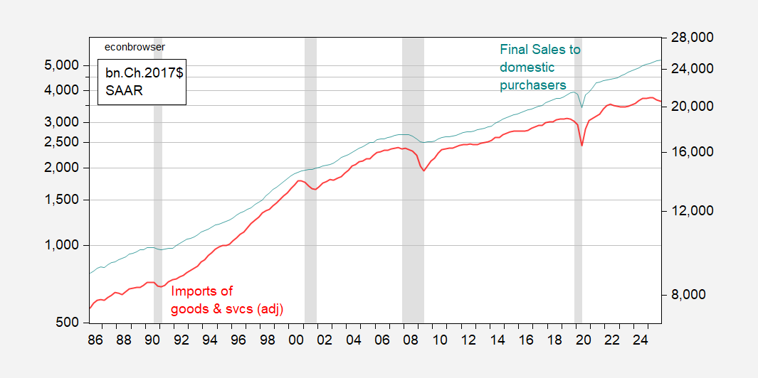 Figure 3: Imports of goods and services, adjusted (red, left log scale), and final sales to domestic purchasers (teal, right log scale), both in bn.Ch.2017$ SAAR. NBER defined peak-to-trough recession dates shaded gray. Source: BEA 2025Q3 updated releases, BEA November trade release, Goldman Sachs, NBER, and author’s calculations.