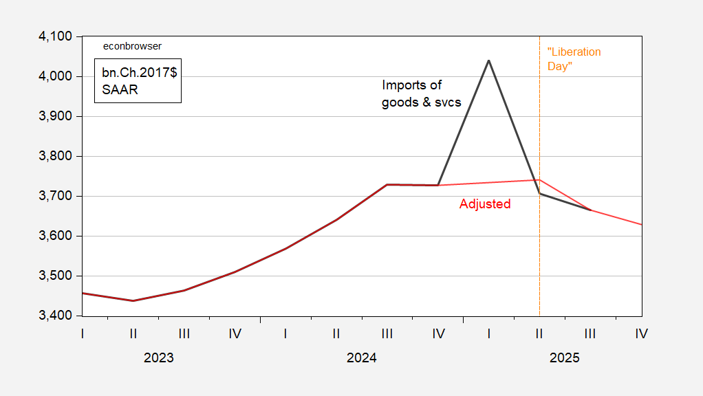 The interesting point is that taking into account the changes inĀ  imports and inventory ac/decumulations in Q1 and Q2, these are pretty equal and opposite in value. This allows one to make a kind of guess of what imports of goods and services would’ve been in the absence of tariff-front-running, and hence better visualize the trend in imports.