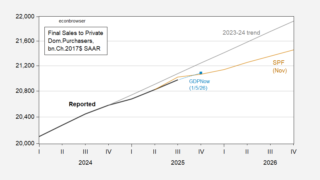 Figure 1: Final sales to private domestic purchasers (bold black), Nov SPF (tan), GDPNow of 1/5 (light blue square), 2023-24 stochastic trend (gray), in bn.Ch.2017$ SAAR. Source: BEA, Atlanta Fed, Philadelphia Fed, and author’s calculations.