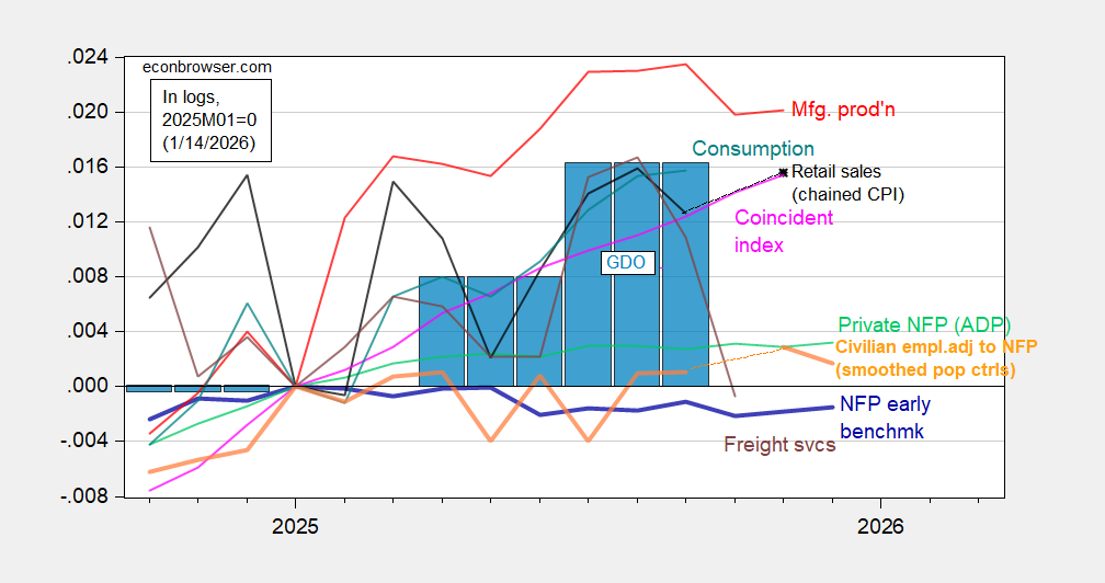 Figure 2: Implied Nonfarm Payroll early benchmark (NFP) (bold blue), civilian employment adjusted to NFP concept, smoothed population controls and 3 month centered moving average (bold orange), manufacturing production (red), personal income excluding current transfers in Ch.2017$ (bold green), real retail sales (black), freight services index (brown), and coincident index in Ch.2017$ (pink), GDO (blue bars), all log normalized to 2021M11=0. Source: Philadelphia Fed [1], Philadelphia Fed [2], Federal Reserve, BTS via FRED, BEA 2025Q3 initial release, and author’s calculations.