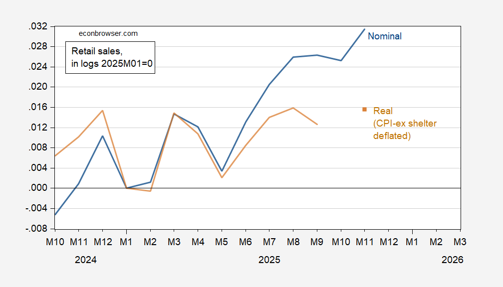 Figure 1: Nominal retail sales (blue), and real retail sales (tan), both s.a., in logs 2025M01=0. Real calculation uses CPI-ex shelter for deflation. Source: Census, BLS and author’s calculations.