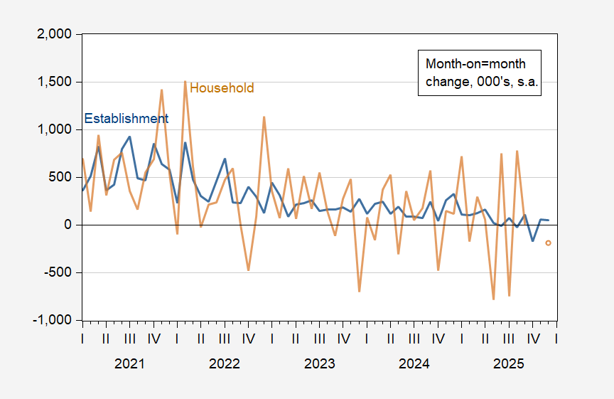Figure 1: Month-on-Month change in NFP (blue), civilian employment (tan), in 000’s.