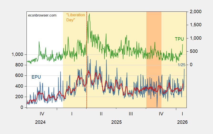 Figure 1: EPU (blue, left scale), seven day centered moving average (red, left scale), and Trade Policy Uncertainty (green, right scale). Source: policyuncertainty.com and Caldara et al. TPU, and author’s calculations.