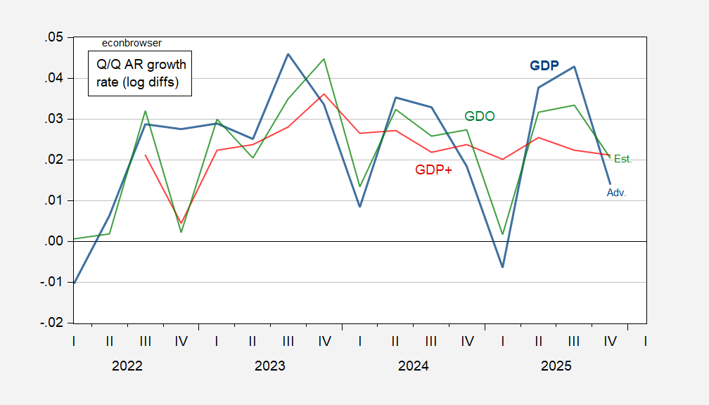 Figure 1: GDP advance (bold blue), GDP+ (red), GDO estimate (green), all Q/Q annualized growth rate, calculated as log first differences. GDO calculated based on estimated net operating surplus for 2025Q4, forecasted using first differences regression on constant, 2021Q1-25Q3. Source: BEA, Philadelphia Fed, and author’s calculations.
