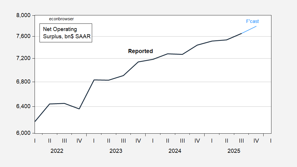 Figure 2: Net Operating Surplus (bold black), projected (red), both in billions $, SAAR. Source: BEA 2025Q3 advance, and author’s calculations.