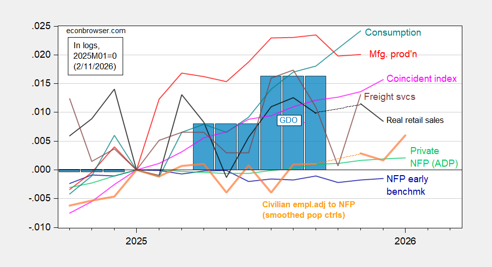 Figure 2: Implied Nonfarm Payroll early benchmark (NFP) (blue), civilian employment adjusted to NFP concept smoothed population controls (bold orange), manufacturing production (red), ADP private nonfarm payroll employment (green), real retail sales, CPI deflated (black), freight services indexes (brown), and coincident index in Ch.2017$ (pink), GDO (blue bars), all log normalized to 2021M11=0. Source: BLS, ADP,via FRED, Philadelphia Fed [1], Philadelphia Fed [2], Bureau of Transportation Statistics, Federal Reserve via FRED, BEA 2025Q3 revised release, and author’s calculations.