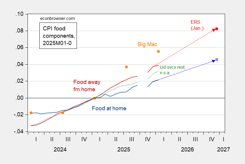 Figure 2: CPI – food at home (blue), ERS January forecast (light blue square), CPI – food away from home (dark red), ERS January forecast (red square), CPI – food away from home, limited services restaurants, n.s.a. (green), Big Mac price, n.s.a. (orange circle), all in logs 2025M01=0. Source: BLS via FRED, BLS, ERS, Economist, and author’s calculations.