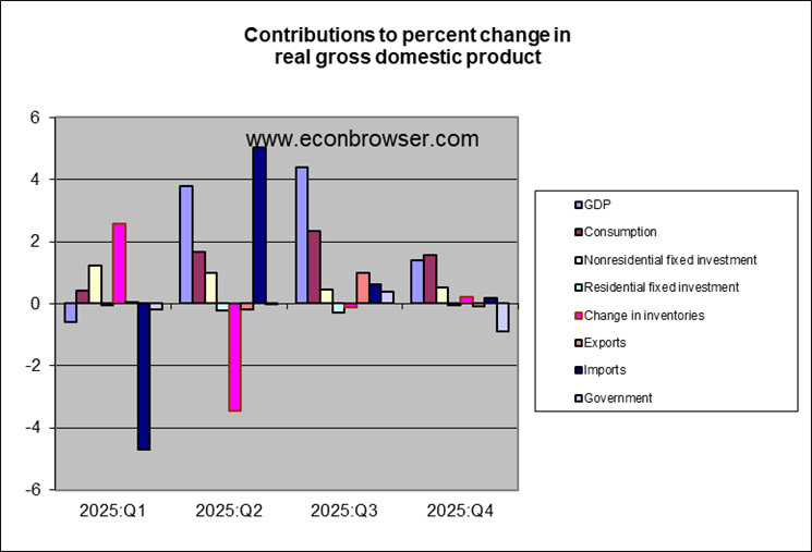 The Bureau of Economic Analysis announced today that seasonally adjusted U.S. real GDP grew at a 1.4% annual rate in the fourth quarter. That is a bit below the historical average growth of 3.1% and also below some analysts’ expectations for the Q4 numbers.