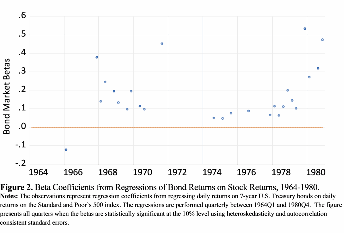 Figure 2 presents the results of regressing returns on 7-year Treasury securities on returns on the Standard and Poor’s 500 stock market index. The estimation is performed using daily data over 90-day windows between 1964 and 1980. The figure presents all of the quarters when the betas are statistically significant at at least the 10% level.