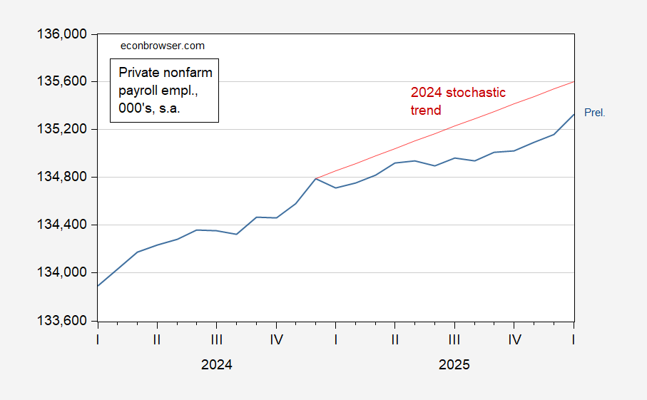 Figure 1: Private nonfarm payroll employment (blue), and 2024 stochastic trend (red), 000’s, s.a. Source: BLS via FRED, and author’s calculations.
