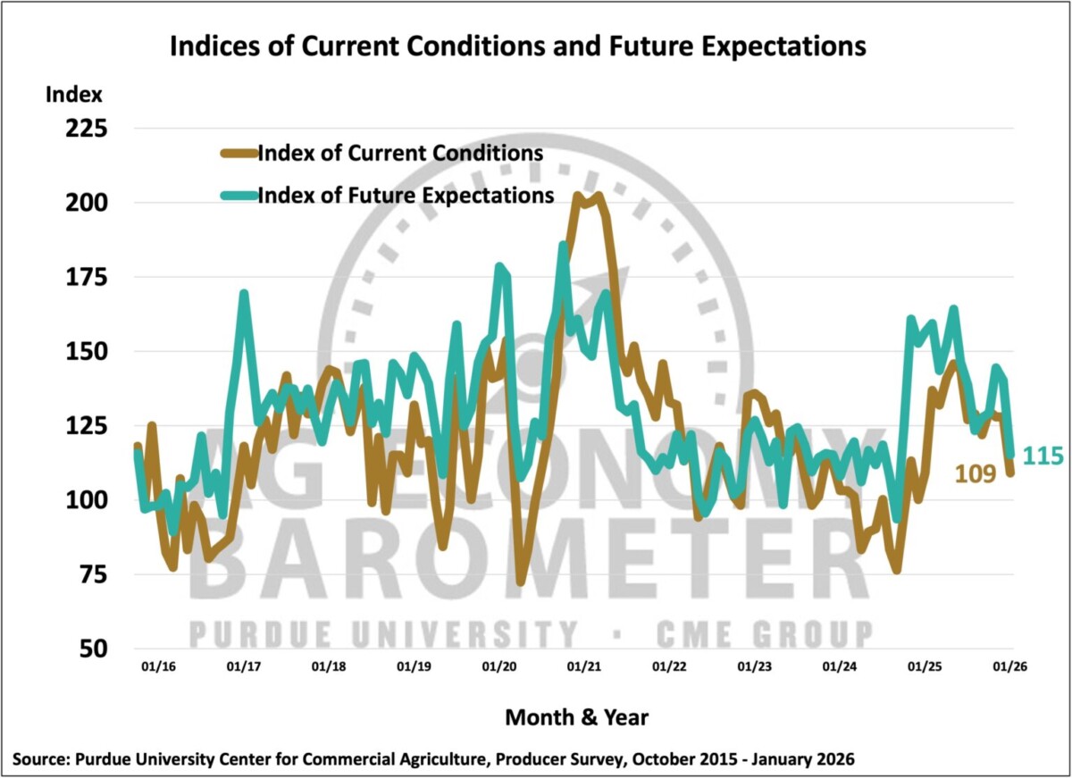 Among the five indices that make up the AEB Index, the largest decline was in the question asking participants whether U.S. agriculture would have good times or bad times in the next five years. The index for this question fell from 122 to 88, marking its lowest point since September 2024. Respondents also expressed greater concerns about agricultural exports compared to last month.