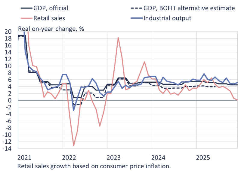 BOFIT’s alternative GDP calculation suggests that economic growth for all of 2025 was roughly 1 percentage point below the official figure. The alternative GDP growth estimate for the fourth quarter was 3.3 %. Industrial output growth accelerated slightly in December from previous months to over 5 % y-o-y. For all of 2025, industrial output rose by roughly 6 % y-o-y. Foreign trade, which is closely linked to industrial output, remained strong throughout the year. Net exports clearly supported economic growth for the entire year.