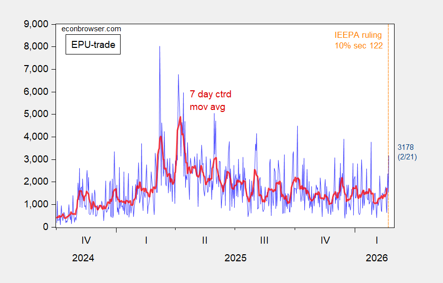 Here’s measured trade policy uncertainty through 2/21 (the announcement of raising the 122 tariff rate from 10% to 15%).