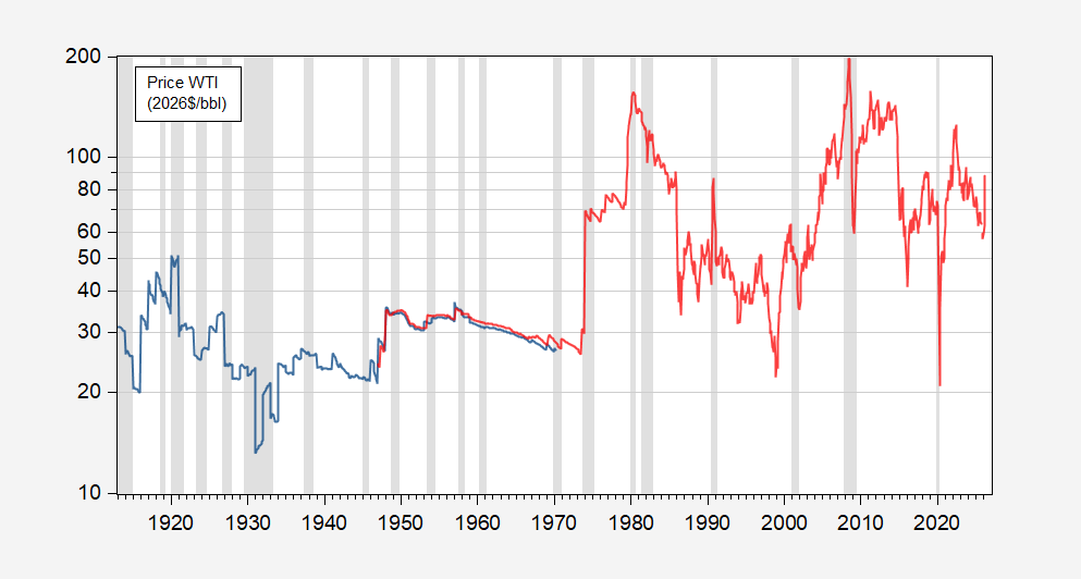 Figure 1: CPI-deflated price of oil (WTI), in 2026$/bbl, annual (blue), monthly (red), both on log scale. NBER defined recession dates shaded gray. Oil prices 1913-1970 annual. March oil price data is through 3/30; March CPI data is Cleveland Fed nowcast. Source: EIA, CPI via FRED, EIA, NBER, and author’s calculations.