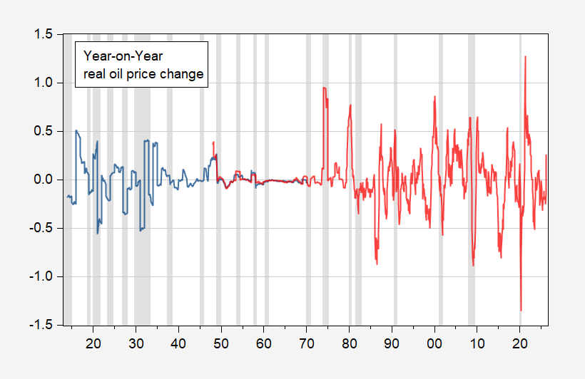 Figure 2: Year-on-Year growth rate of CPI-deflated price of oil (WTI), in 2026$/bbl, annual (blue), monthly (red), both on log scale. NBER defined recession dates shaded gray. Oil prices 1913-1970 annual. March oil price data is through 3/30; March CPI data is Cleveland Fed nowcast. Source: EIA, CPI via FRED, EIA, NBER, and author’s calculations.