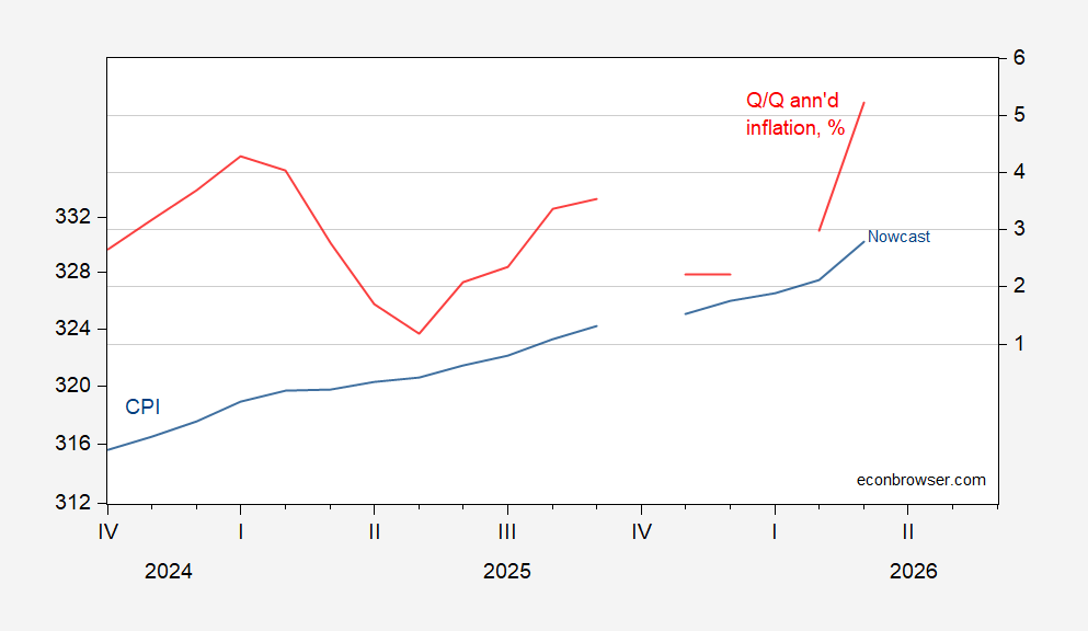 Figure 1: Headline CPI (blue, left log scale), quarter-on-quarter annualized inflation, % (red, right scale). Source: BLS, Cleveland Fed accessed 3/31, and author’s calculations.