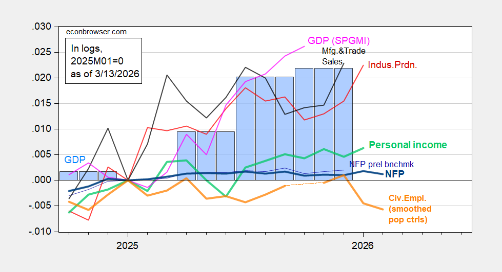 Figure 1: Implied nonfarm payroll (NFP) employmennt preliminary benchmark revision (thin blue), NFP employment (bold blue), civilian employment with smoothed population controls (bold orange), industrial production (red), personal income excluding current transfers in Ch.2017$ (bold light green), manufacturing and trade sales in Ch.2017$ (black), and monthly GDP in Ch.2017$ (pink),GDP (blue bars), all log normalized to 2025M01=0. Source: BLS via FRED, BLS, Federal Reserve, BEA 2025Q4 2nd release,S&P Global Market Insights (nee Macroeconomic Advisers, IHS Markit) (1/22/2026 release), and author’s calculations.