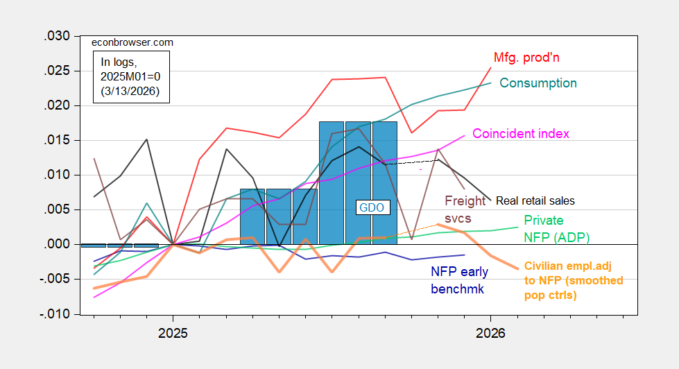 Figure 2: Implied Nonfarm Payroll early benchmark (NFP) (blue), civilian employment adjusted to NFP concept smoothed population controls (bold orange), manufacturing production (red), ADP private nonfarm payroll employment (green), real retail sales, CPI deflated (black), freight services indexes (brown), and coincident index in Ch.2017$ (pink), GDO (blue bars), all log normalized to 2021M11=0. Source: BLS, ADP,via FRED, Philadelphia Fed [1], Philadelphia Fed [2], Bureau of Transportation Statistics, Federal Reserve via FRED, BEA 2025Q4 2nd release, and author’s calculations.