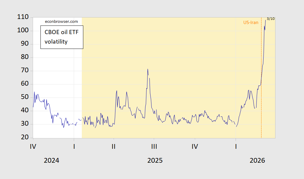 While oil prices are down, the implied volatility of oil prices remains high. Here’s the CBOE oil ETF volatility index: