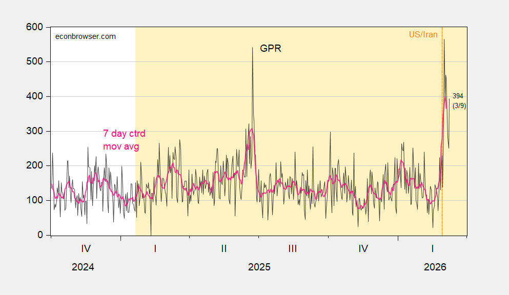 Figure 2: Geopolitical Risk Index (black), 7 day centered moving average (pink). Source: Caldara, et al., and author’s calculations.