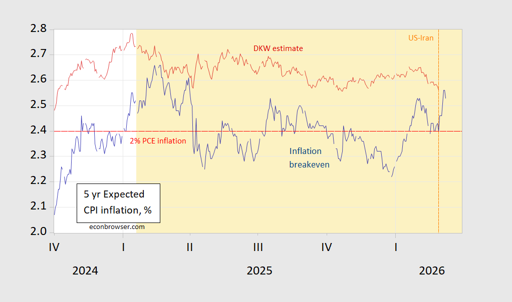 Inflation breakeven and DKW estimates of 5 year inflation.