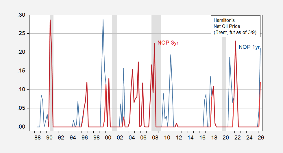 The one year measure is due to Hamilton (JPE, 1983) and the three year to Hamilton (J.Econometrics, 2003). Jim’s recent review of oil prices and macroeconomy in the New Palgrave of Economics here.