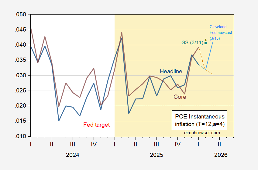 Goldman Sachs tracking ticks higher core PCE inflation for February. The Cleveland Fed’s core nowcast imply lower instantaneous inflation for February and March.
