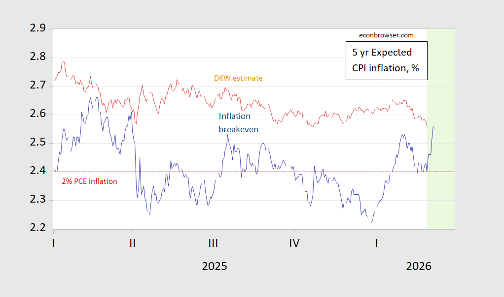 Figure 1: 5 year Treasury-TIPS spread (blue), DKW expected inflation (tan), both in %. Red dashed line indicates CPI inflation rate consistent with 2% PCE inflation, Light green shading denotes US-Iran conflict. Source: Treasury, Fed DKW.