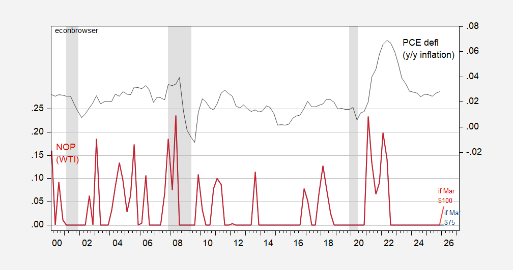 Figure 2: Hamilton Net Oil Price (NOP) for WTI, if March price at $75/bbl (blue, left scale), at $100/bbl (red, left scale), PCE y/y inflation (black, right scale). NBER defined peak to trough recession dates shaded gray. Source: EIA via FRED, BEA, and author’s calculations.