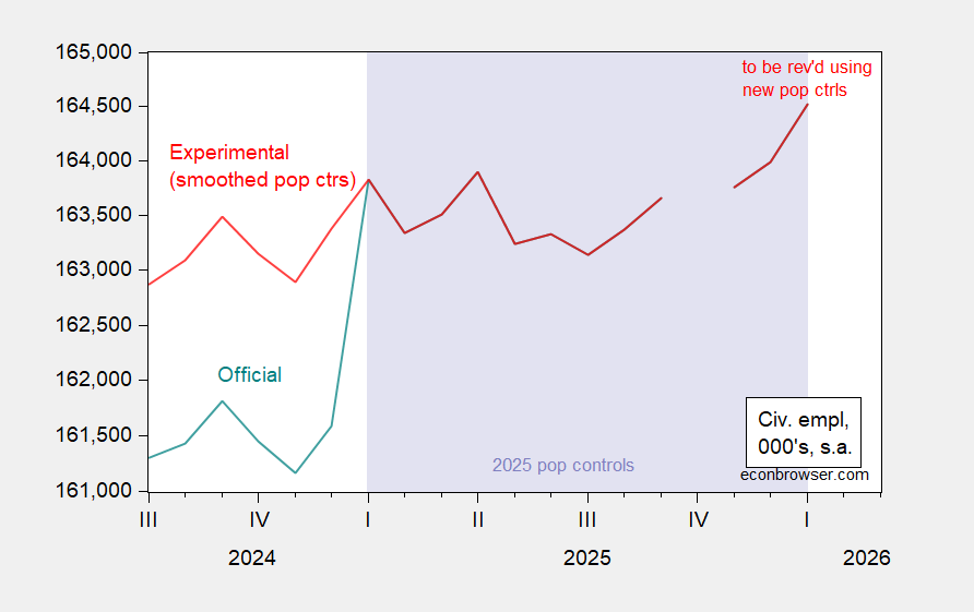 Figure 2: Official civilian employment (teal), experimental civilian employment, using smoothed population controls (red), both in 000’s, s.a. LIght lilac shaded area denotes data using 2025 population controls. Source: BLS via FRED, BLS.