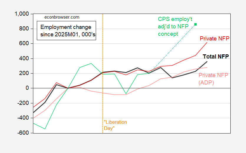 Figure 1: Official BLS nonfarm payroll employment (bold black), official BLS private nonfarm payroll (dark red), ADP private nonfarm payroll employment (light red), civilian employment adjusted to NFP concept, 3 month centered moving average (light green), change since 2025M01, in 000’s s.a. Source: BLS, ADP via FRED, BLS, and author’s calculations.