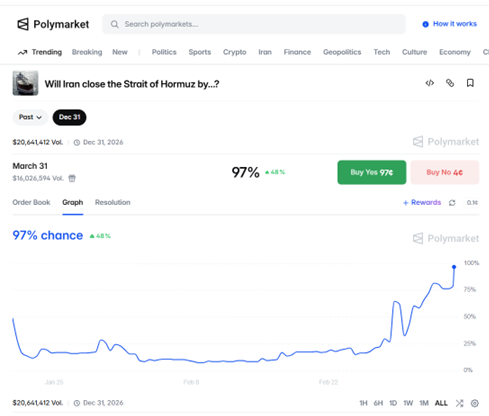 Polymarket (8pm CT 3/6) reads 97% probability of closure by 3/31, as defined by the contract as an 80% reduction in 7 day moving average in traffic.