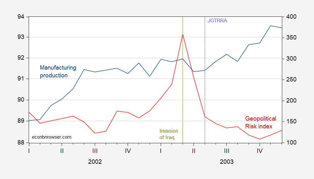 Figure 2: Manufacturing production (blue, left log scale), Geopolitical Risk (GPR) index (red, right scale). Source: Federal Reserve via FRED, Caldara et al