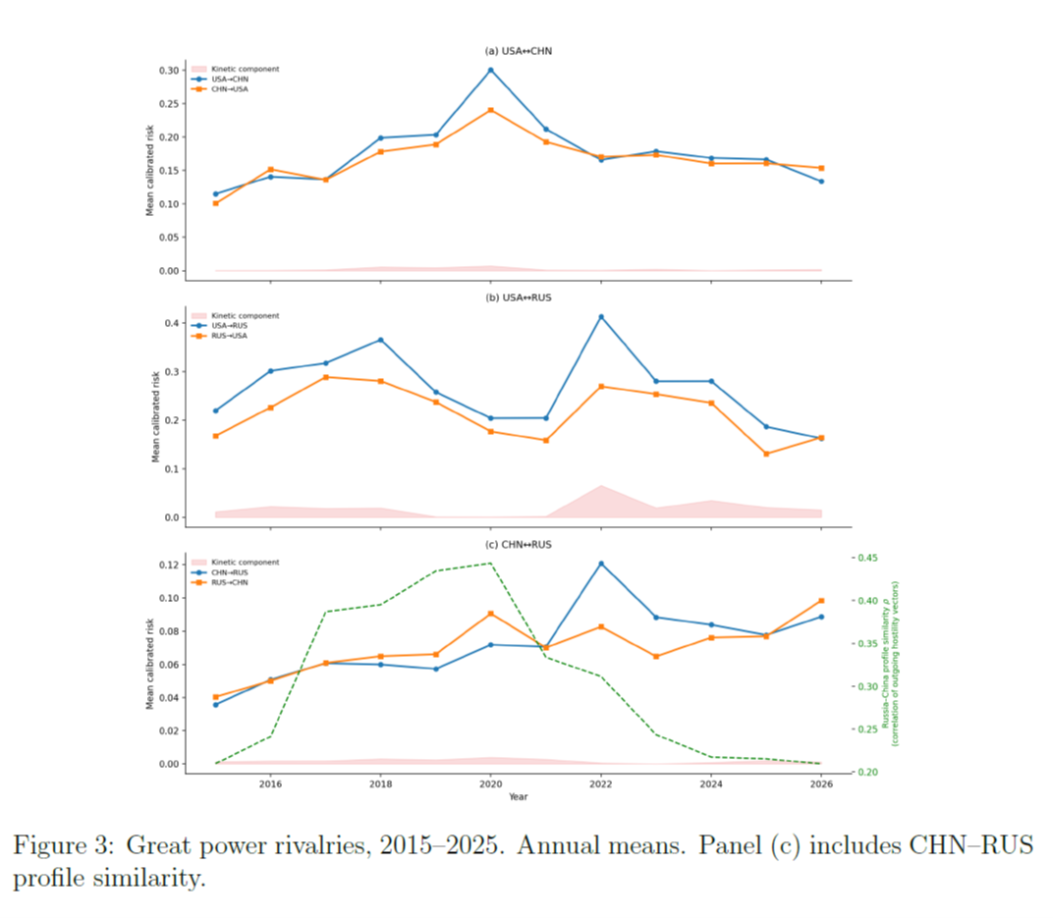 responses.Three sets of findings emerge. First, the decomposed panel tracks the key geopolitical developments of the past decade. The Russia–Ukraine relationship militarises long before 2022. The US–China confrontation is overwhelmingly economic. These patterns are invisible to an aggregate indicator (Section 3).