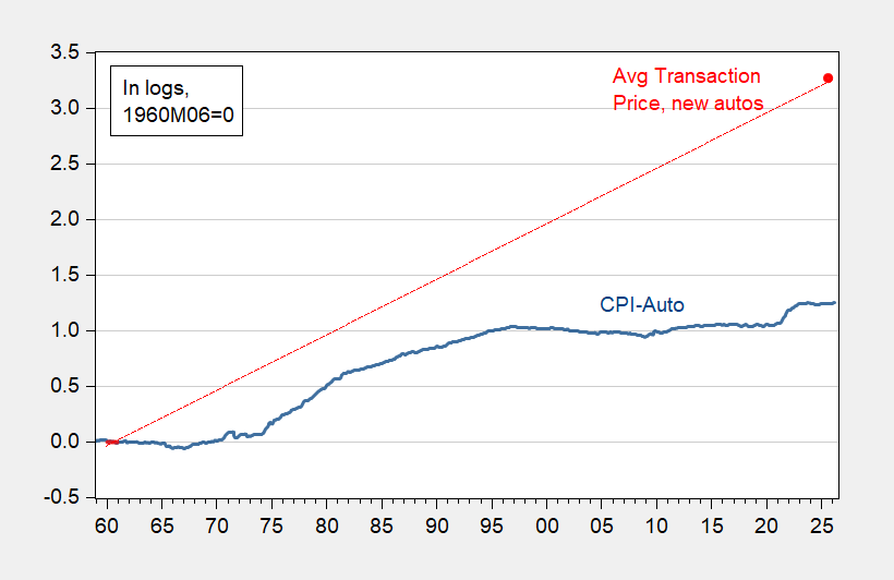 Figure 1: CPI-new autos (blue), average transaction price of a new auto (red), both in logs 1960M06=0. Source: BLS, Cox, and author’s calculations.