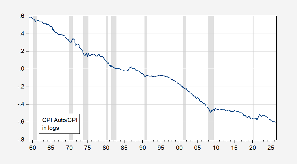 The relative price of autos, quality/mix adjusted, has indeed fallen. However. what’s true is that to the extent that autos are tradable (and were more tradable under NAFTA/USMCA pre-IEEPA), one should expect the relative price of cars to fall (Balassa-Samuelson!). The question is whether they could have fallen more if tradability was enhanced (maybe by opening up to EVs).