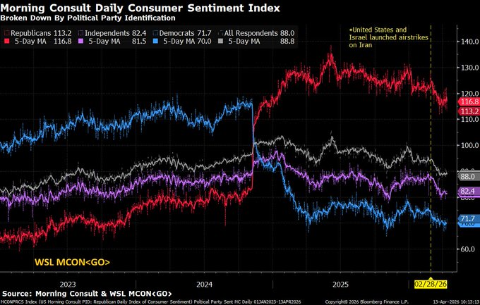 Morning Consult confirms the drop, but shows an late divergence in trends between Republicans and Democrats, which does not show up in the U.Mich series.