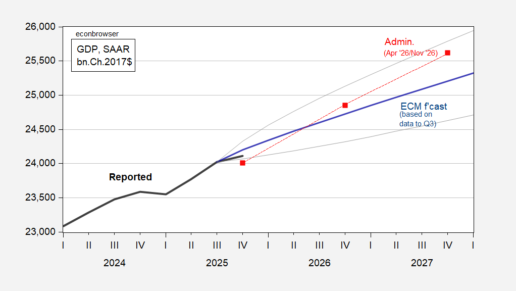 I use a simple error correction model with (log) GDP as the left hand side variable, and GDP and population as an error correction term, estimated over the 1986Q4-2019Q4 ad 2021Q1-2025Q3 period (excluding the pandemic, and with data available to the Troika). I then use the CBO’s reported Census projection of over-16 population to forecast out (the long run elasticity of output with respect to population is 2.1).