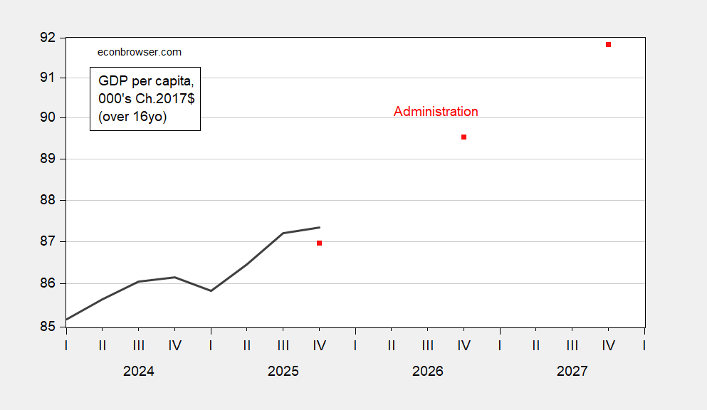 The Administration’s path is within the +/- one standard error band through 2027Q4, so the forecast is in that sense plausible, based on sampling error. However, the Administration’s path does suggest something interesting about output per capita.