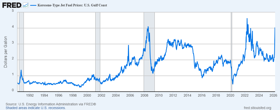 From a year ago through March 30, gasoline price (regular) has risen 26.2%, 50.4% for diesel. For jet fuel (Louisiana), it’s risen 90.2%.