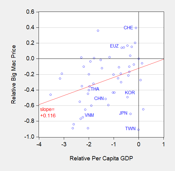 Figure 1: Log relative price of Big Mac (to US) vs. log relative per capita income (to US). Regression line (red). Source: Economist, January 2026, and author’s calculations.