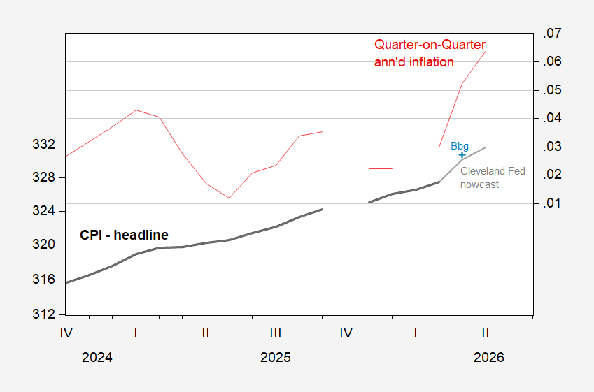 Figure 1: CPI as reported (bold black, left log scale), Cleveland Fed nowcast (gray, left log scale), Bloomberg consensus (light blue +, left log scale), Quarter-on-Quarter annualized CPI headline inflation using nowcasts (red, right scale). Source: BLS, Cleveland Fed accessed 4/7, Bloomberg, and author’s calculations.