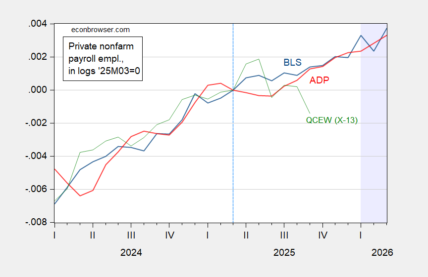 Figure 1: Official BLS private nonfarm payroll series (blue), ADP series (red), QCEW series, seasonally adjusted by author using X-13 (in logs) (green), all in log differences from last benchmark 2025M03 (marked in dashed light blue line). Light blue shading denotes 2026 observations.  Source: BLS, ADP via FRED, BLS, and author’s calculations.