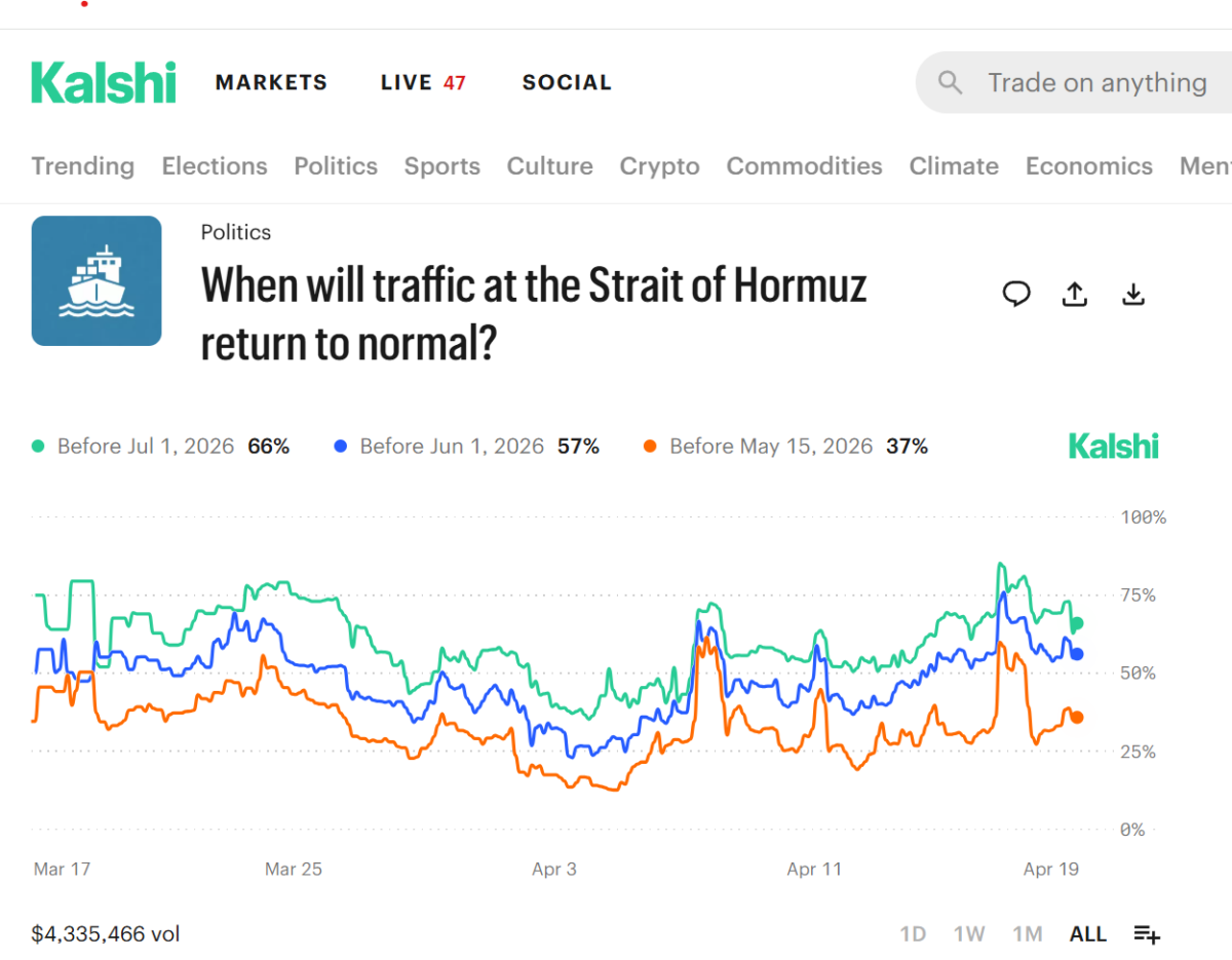 Prediction Markets on Hormuz Strait and June Brent Futures: 6:30PM ET Leave a reply The optimism of Friday has been wiped away. The odds of a re-opening by May 15 down to 37%, and June contracts up by 5.9%.