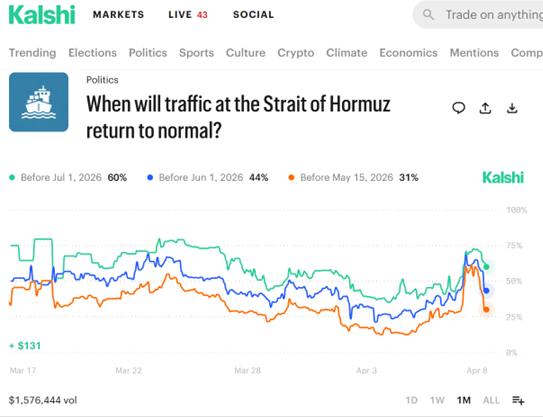 Prediction Markets on Trump Credibility Re: Reopening the Strait Leave a reply From Kalshi: Source: Kalshi, accessed 4/8/2026, 4:10pm CT.