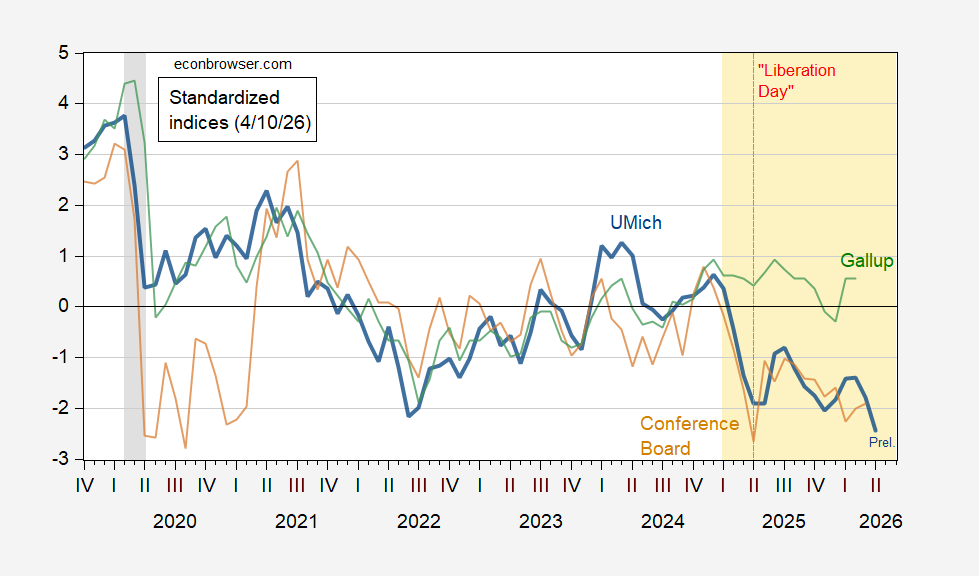 Figure 1: U.Michigan Economic Sentiment (blue), Conference Board Confidence Index (brown), Gallup Confidence (green), all demeaned and divided by standard deviation 2021M01-2025m02. Red dashed line at “Liberation Day” Source: UMichigan, Gallup, Conference Board, and author’s calculations.