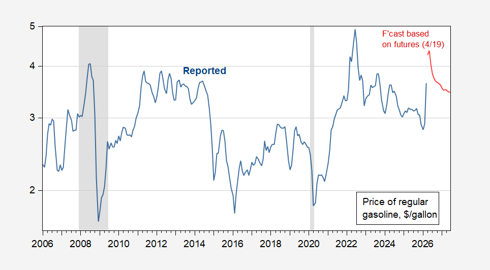 Figure 2: Price of regular gasoline (blue), and forecast based on Brent futures (red), both $/gallon. NBER defined peak-to-trough recession dates shaded gray, barchart.com, NBER, and author’s calculations.