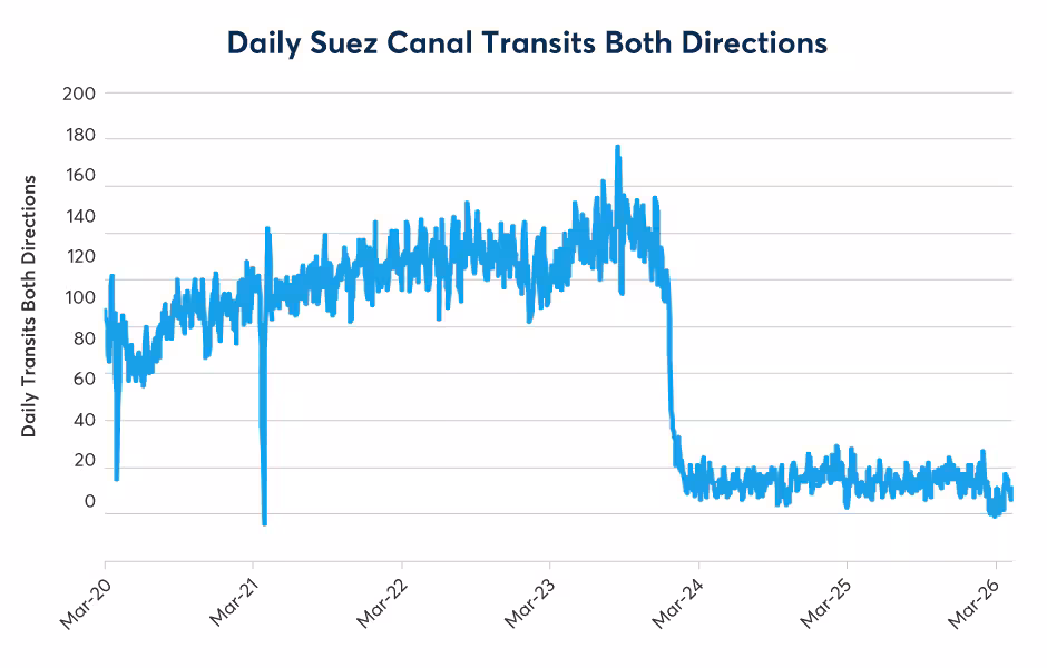 One key indicator to watch is shipping traffic through the Strait of Hormuz (Figure 7). Also, what happened to shipping traffic through the Red Sea and the Suez Canal offers a warning about how supply disruptions can carry on for longer than initially expected. After Suez traffic dropped off in late 2023, it never recovered in part because insurance companies withdrew from the market (Figure 8).