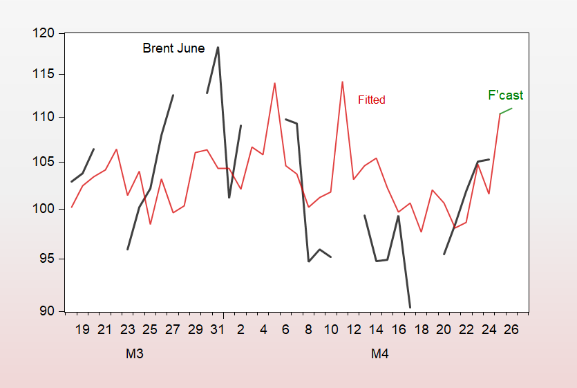 Where Will Brent Futures Open Today? Leave a reply My guess, using Kalshi and EPU, is for $111 yesterday (assuming EPU is the same as yesterday): Figure 1: Brent NYMEX June futures (bold black), fitted (red), forecast (green), all in $/bbl.